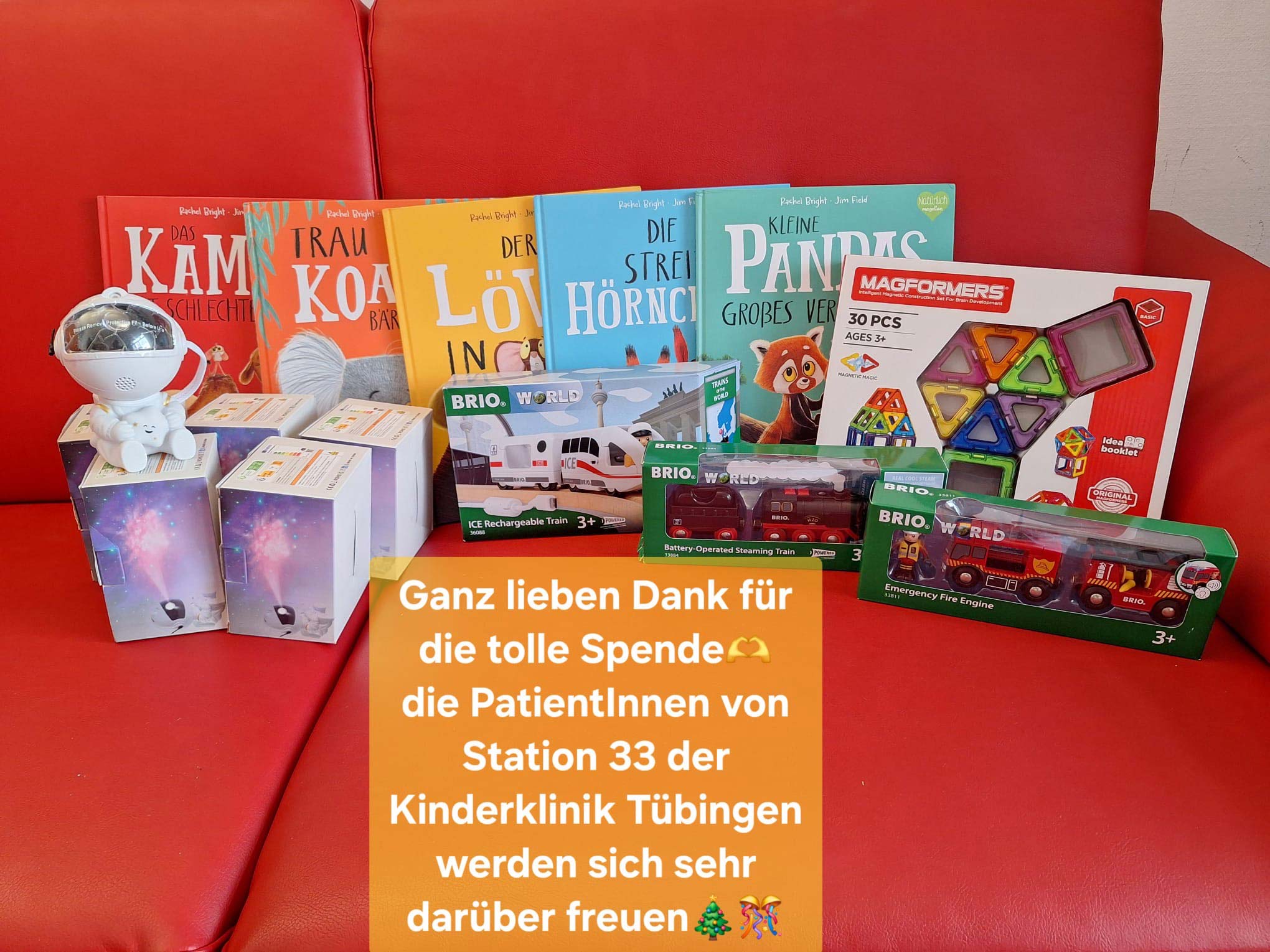 Die Aktion in Tübingen bedeutet uns dabei ganz besonders viel. Auf der Station 33 wurde unser Marcel vom ersten Tag an begleitet. Dort haben wir Hoffnung getragen und Angst ausgehalten, haben gelacht und geweint, Tage, Wochen und Monate unseres Lebens verbracht. Genau an diesem Ort nun ein Stück Freude zurückgeben zu dürfen, bedeutet für uns mehr, als Worte je beschreiben könnten. Kleine Geschenke und doch so viel Freude für Kinder, die Weihnachten in der Klinik verbringen mussten. 🎄✨